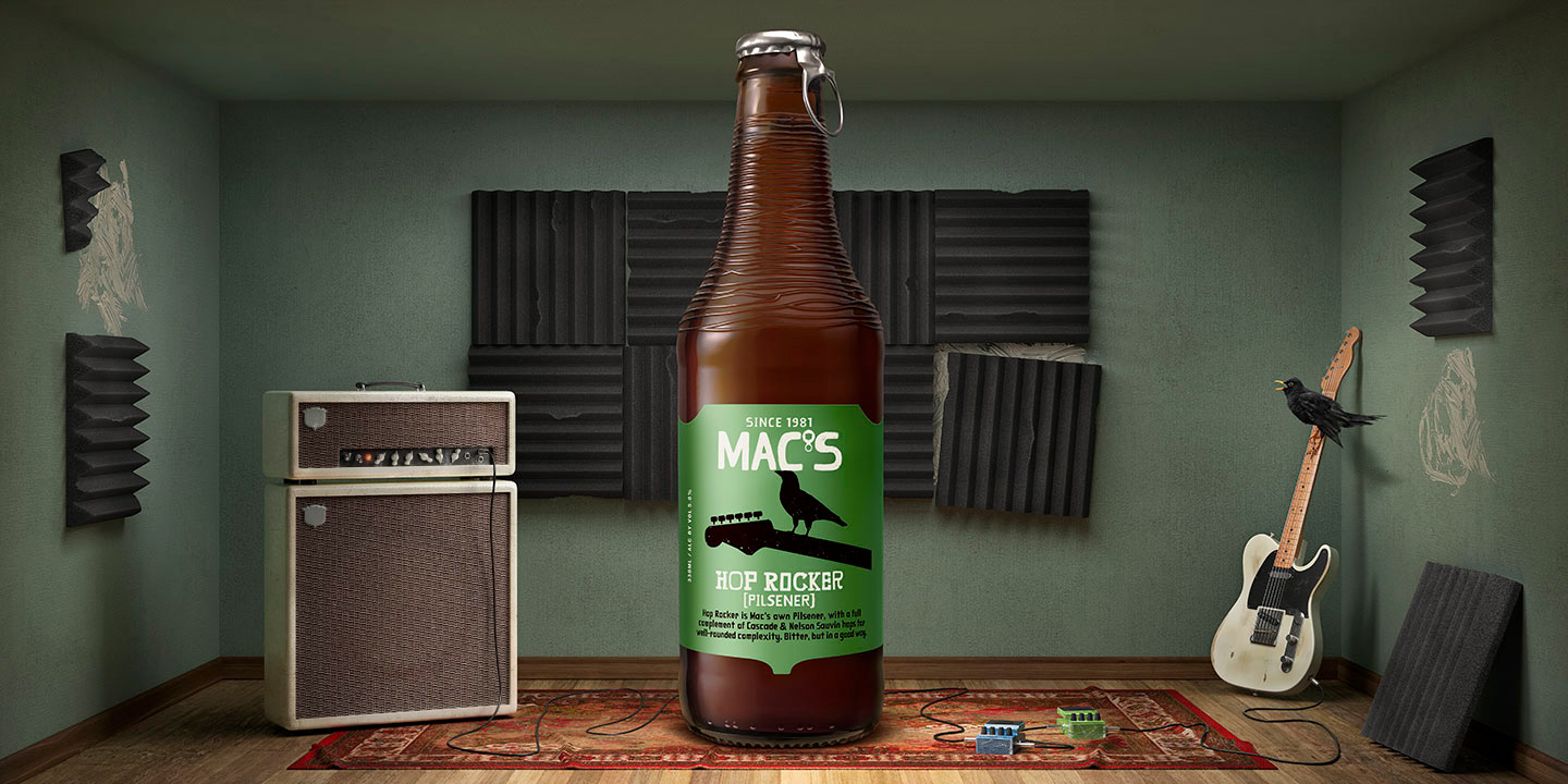 This guy's got attitude and likes to make noise, just like his Fender! Created entirely in CGI, with the exclusion of the bottle and the bird.
