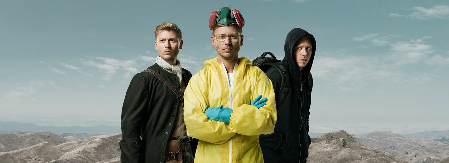 This image was used to promote Spark's On Demand TV service 'Lightbox' showcasing the high quality shows it offers with Spark front man Matt becoming the lead characters from the shows Outlander, Breaking Bad & Mr Robot.