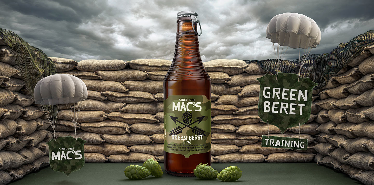 Mac's new range includes the 'Green Beret - IPA'. Just like the beer itself, we used a perfect blend of Photography, CGI & Retouching to create this stunning image.