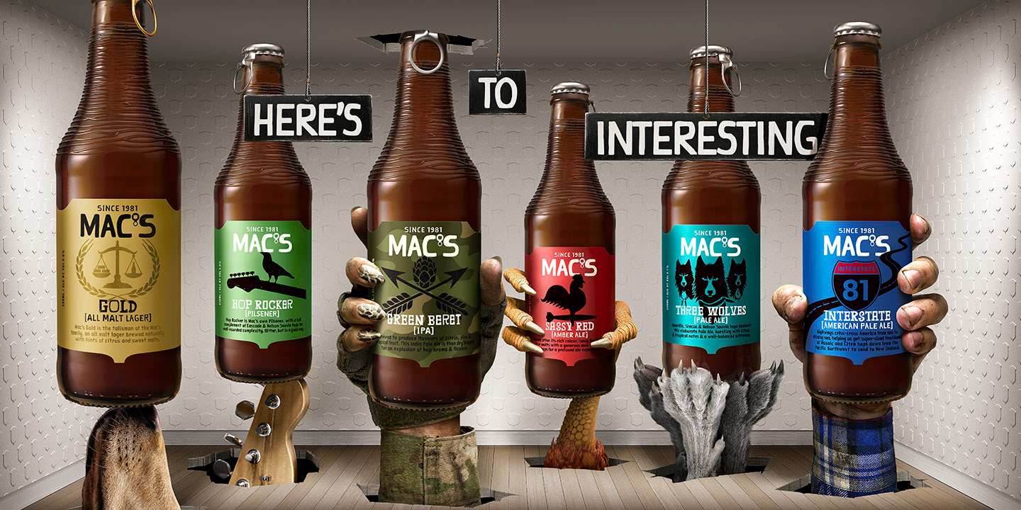 Hard to choose a favourite out of these tasty drops. This image was created to showcase the different characters within the Mac's Beer Range.